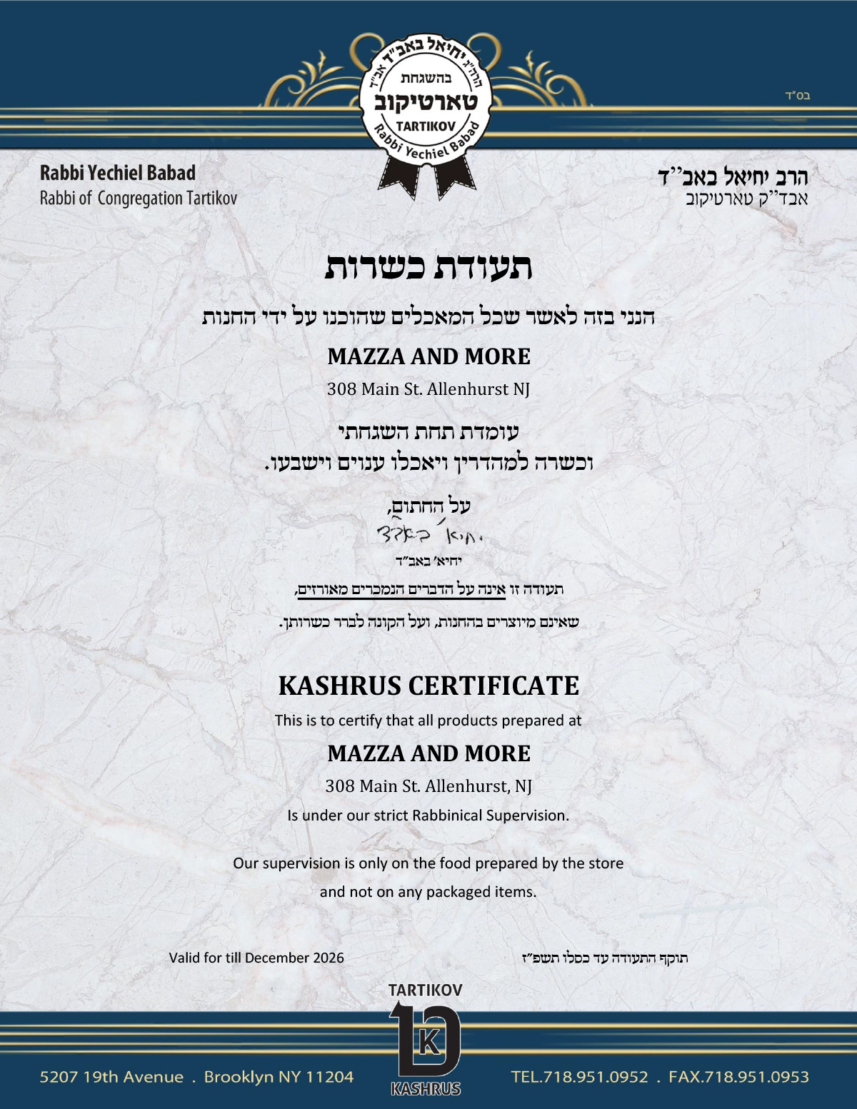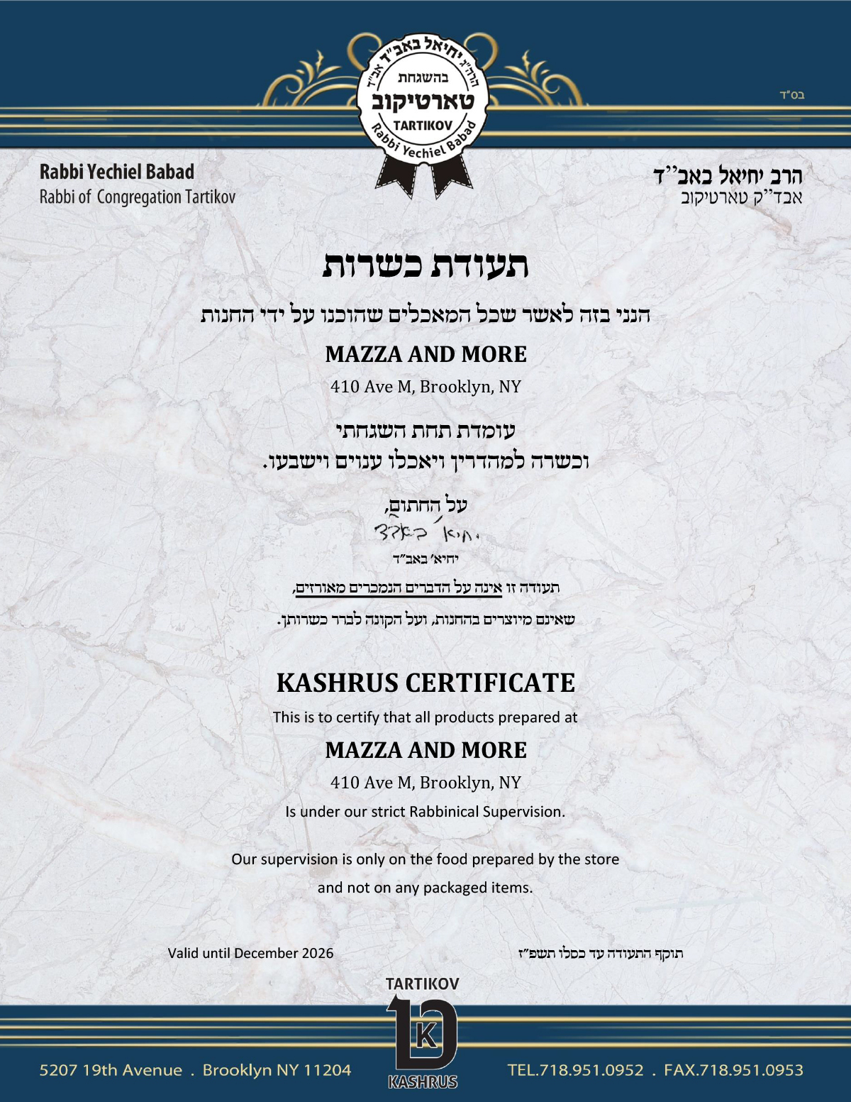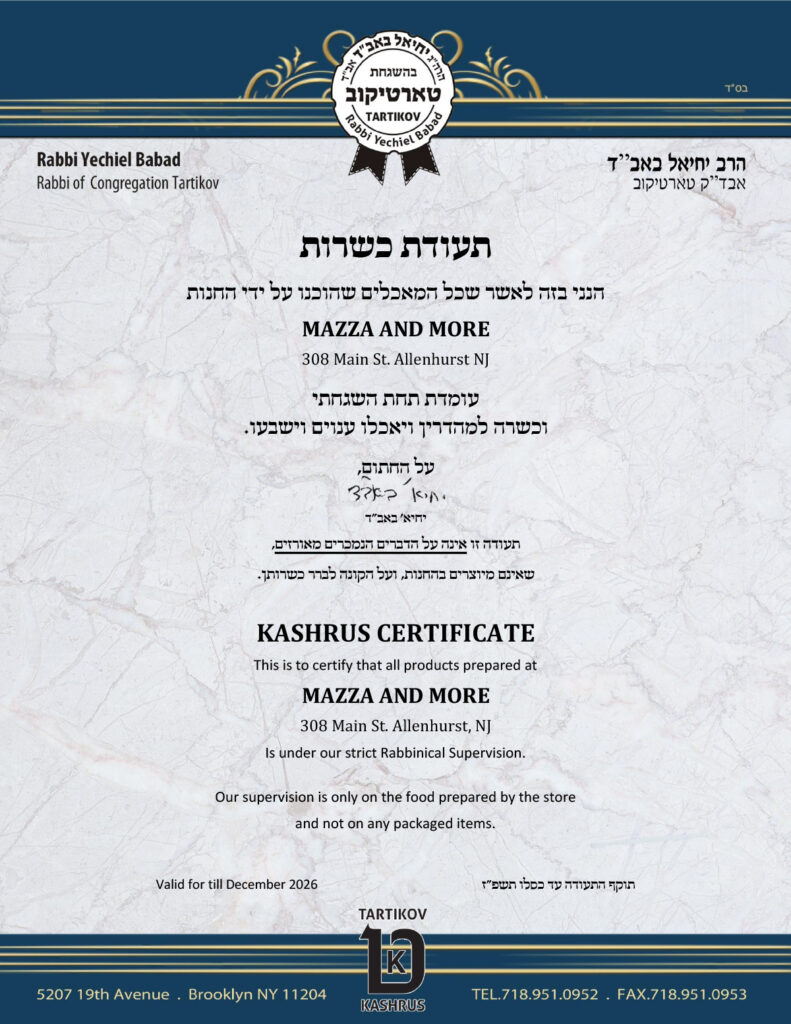 With our strict adherence to Kashrut and the supervision of Rabbi Yechiel Babad “Tartikov,” you can trust that every meal at our restaurant is prepared to the highest standards of Jewish dietary law.